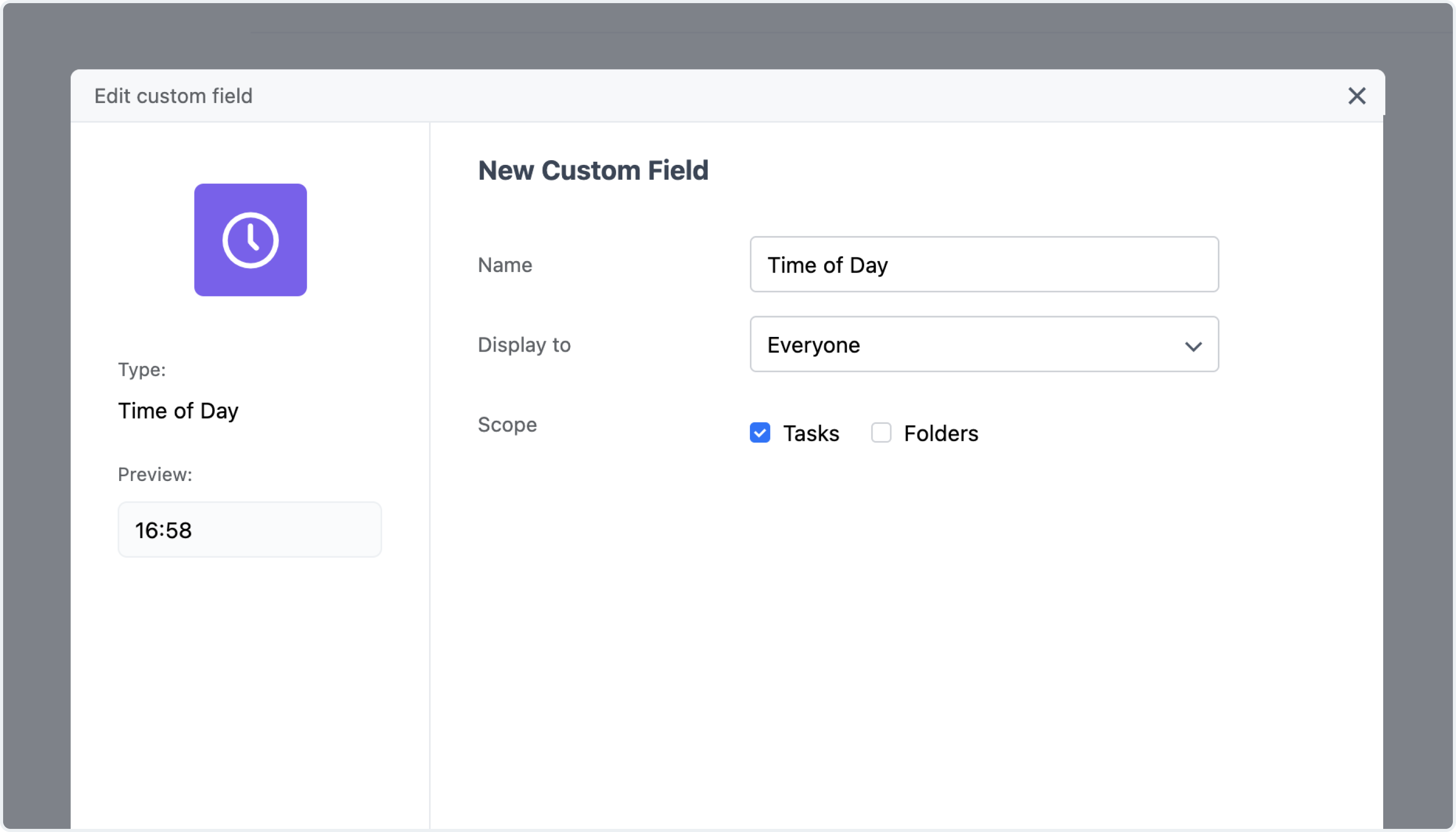 The "Time of Day" custom field lets you record specific times without including the full date. It’s ideal for tracking time-related details, actions, or events where only the time matters, keeping everything organized and easy to reference.