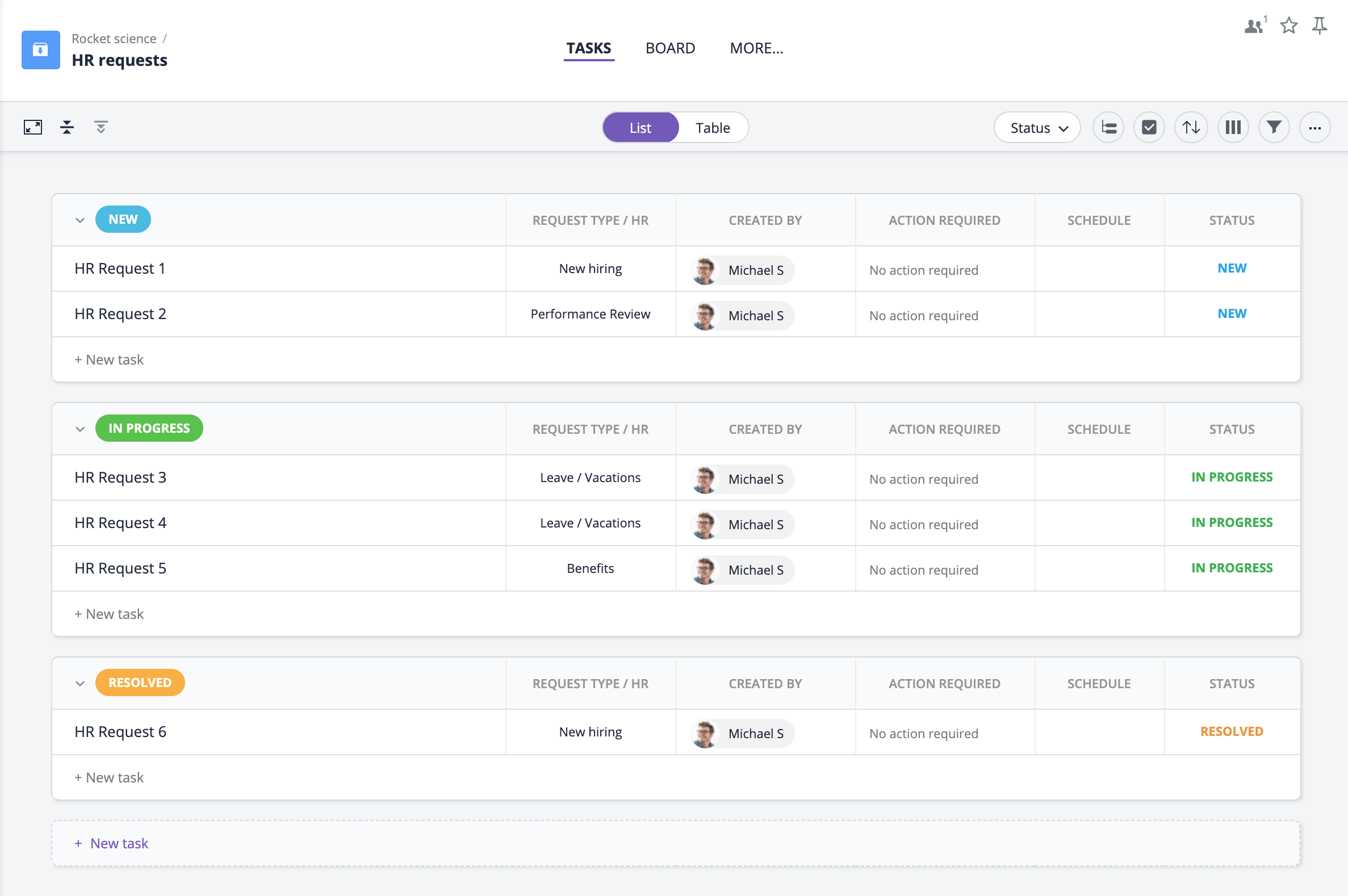 As a shared service department, HR receives requests from all teams. Wouldn’t it be great to make sure all users have access to GoodDay to submit their request to HR right within the system, so the HR team receives them immediately and every single request is fully tracked? Use this template for this purpose and see the productivity of request resolution improve very quickly. The preconfigured fields in the template allow tracking the user that submitted the request, the HR team member responsible for addressing the request, as well as request type, status and more. The Board allows the HR team to see the full picture of their requests queue